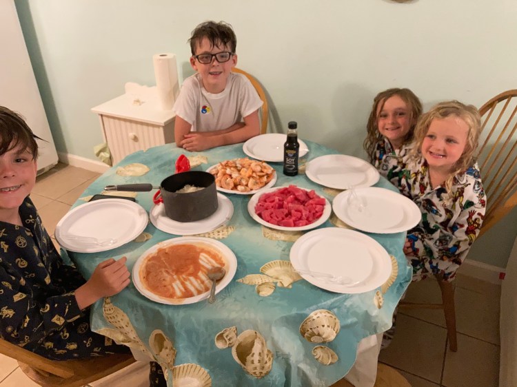 Vacation FUN Part 2 in Galveston, TX as โRADโ as possible with 2 sets of twins (fraternal 4 yr old girls & identical 12 yr old boys). Fresh Maguro (Tuna) Sashimi, Boiled Gulf Shrimp & Rice for dinner then capping it off with doing our nails RAINBOW style! ![]()