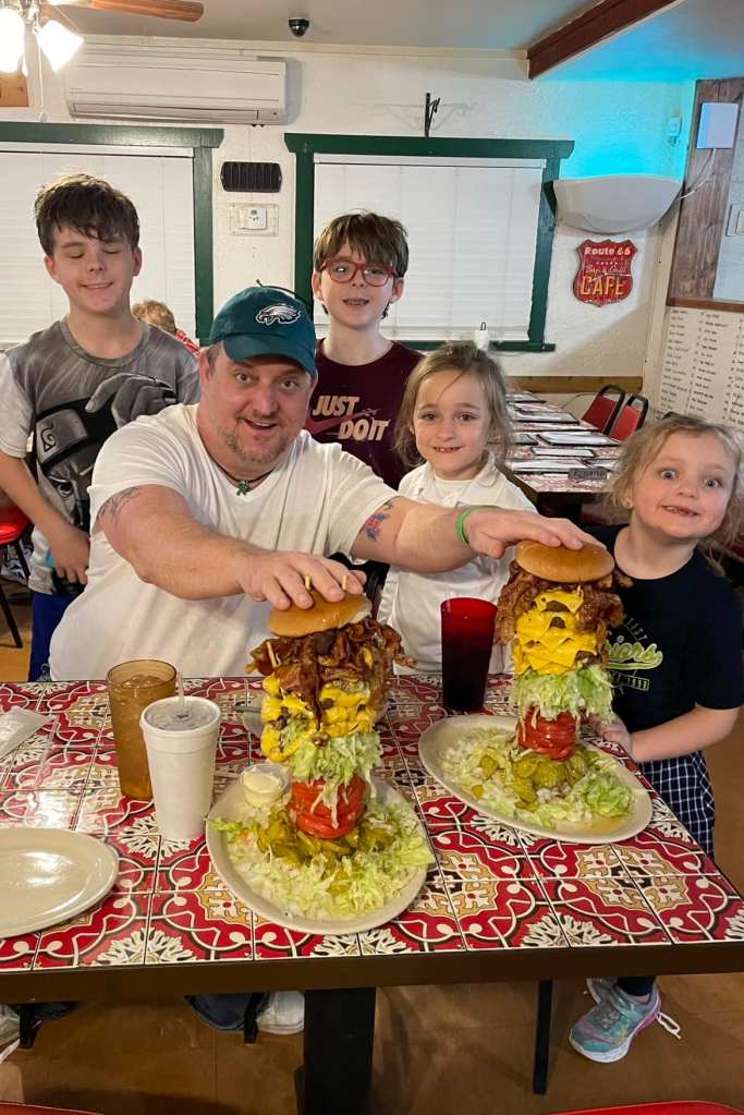 As Radical as Dad/Kid Dining gets!!! Each Burger is 5 beef patties, 10 slices of cheese, a pound of bacon AND a crap load of lettuce, tomatoes, onions & pickles!