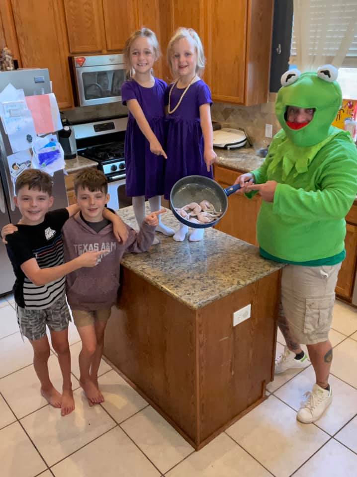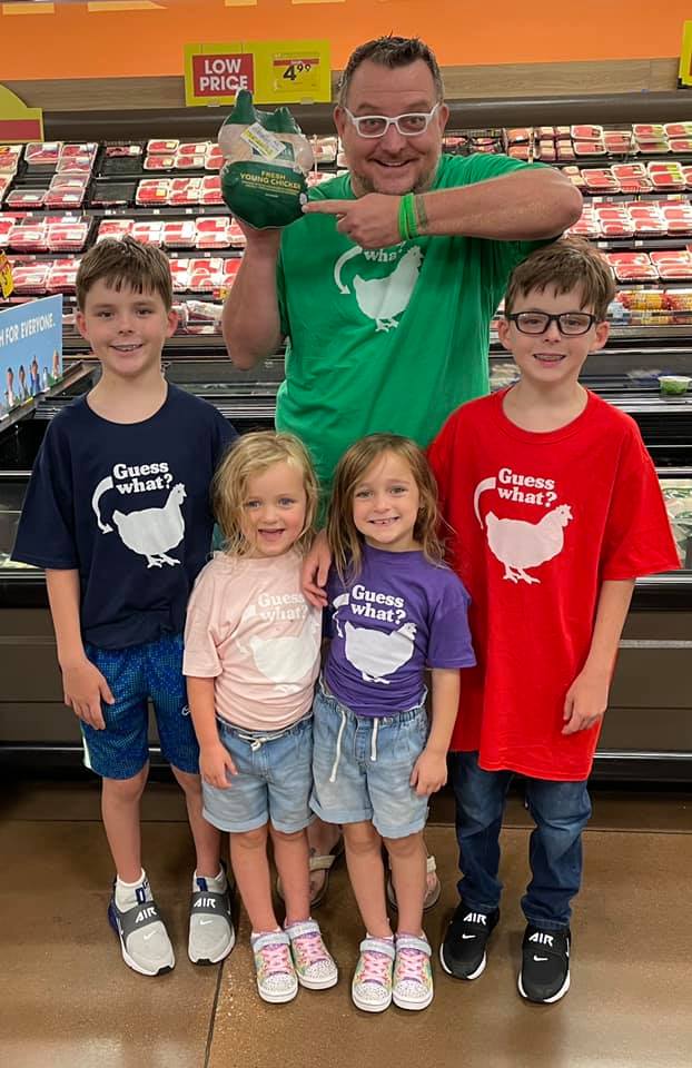 Yes, I know I’m pointing at the wrong end of the chicken. The real magic trick is to get 4 kids all together, arms & hands in a way that you can see the shirts, looking the same way, eyes open, and SMILING! TA DA!!!
