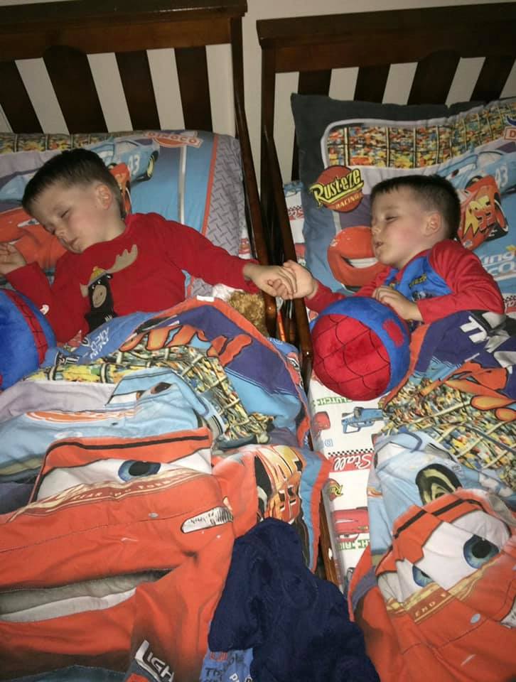 This is the most favorite picture I have of my twin boys (1st set of twins as I have twin girls age 5 now too) from when they were 3 years old 9 years ago. Their beds were positioned as normal about 3 or 4 feet apart and I put them to bed. An hour or so later I came to check on them and found that they had pushed their beds together and were sound asleep holding hands.