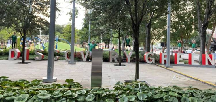 Discovery Green has been completely redone and is quite the center piece for downtown Houston. We like to enjoy it year round. Here we are enjoying it ‘Rad Dad’ Style dressed in all match H-Town Gear:)