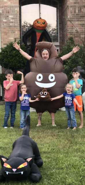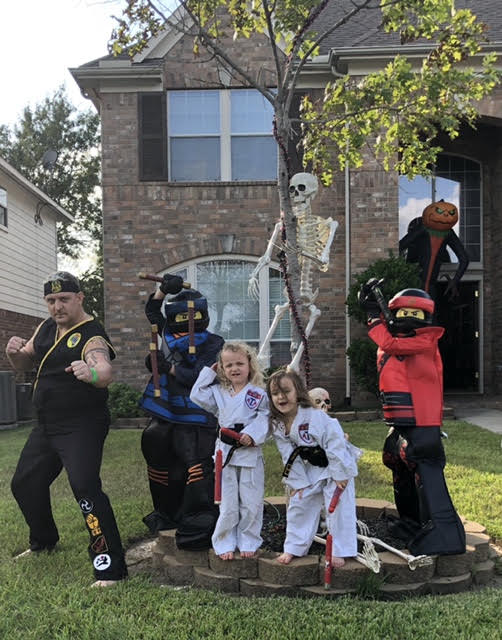 get creative with how to safely dole out candy and Dad has an “interesting” costume to match his twin daughters as well as his twins sons! Social Distance Trick Or Treating T-Shirt Cannon Turned Candy Cannon! (ran out of costume changing time to fit Cobra Kai Skeletons from Karate Kid 1984 Halloween Night throw back from earlier prep/former post pictures)